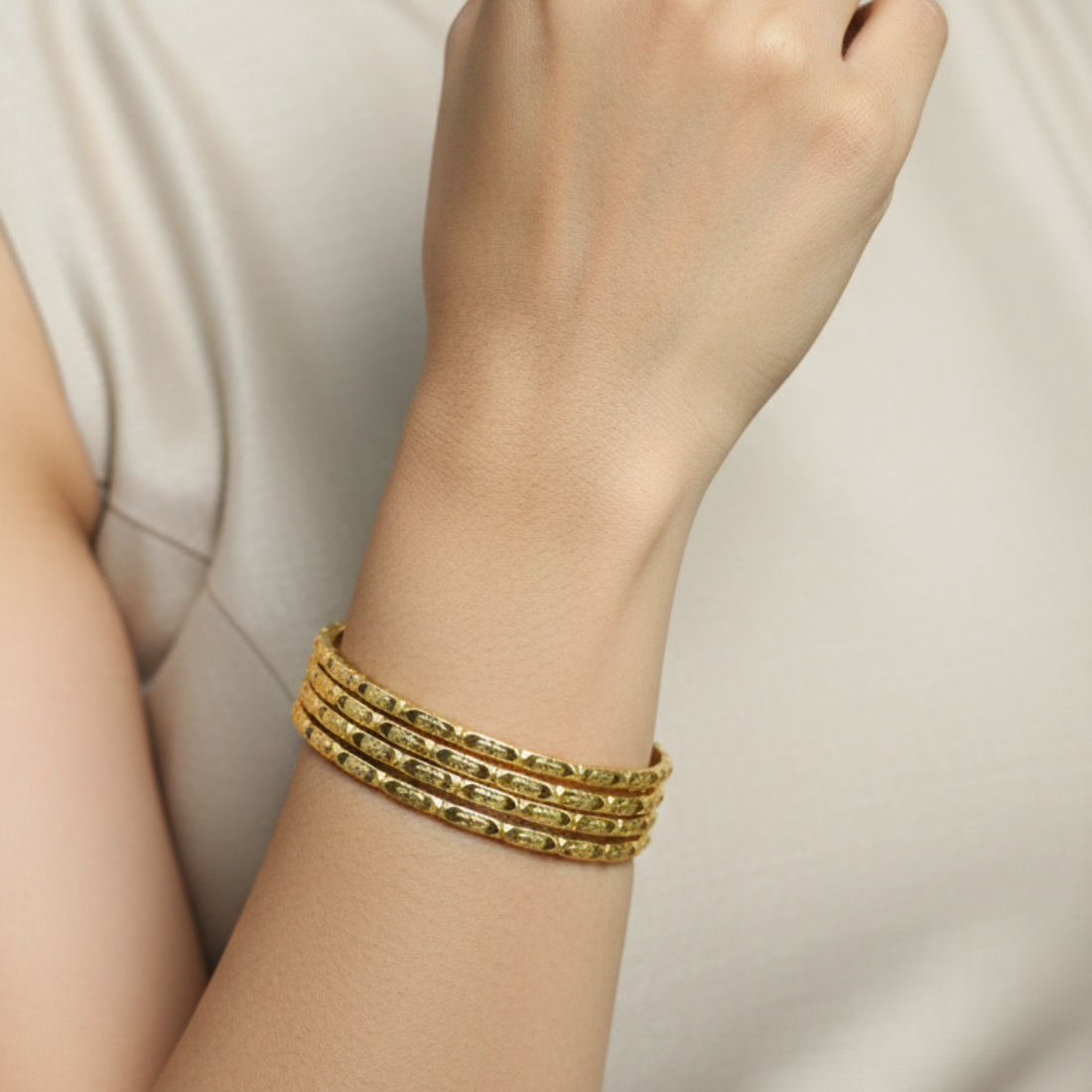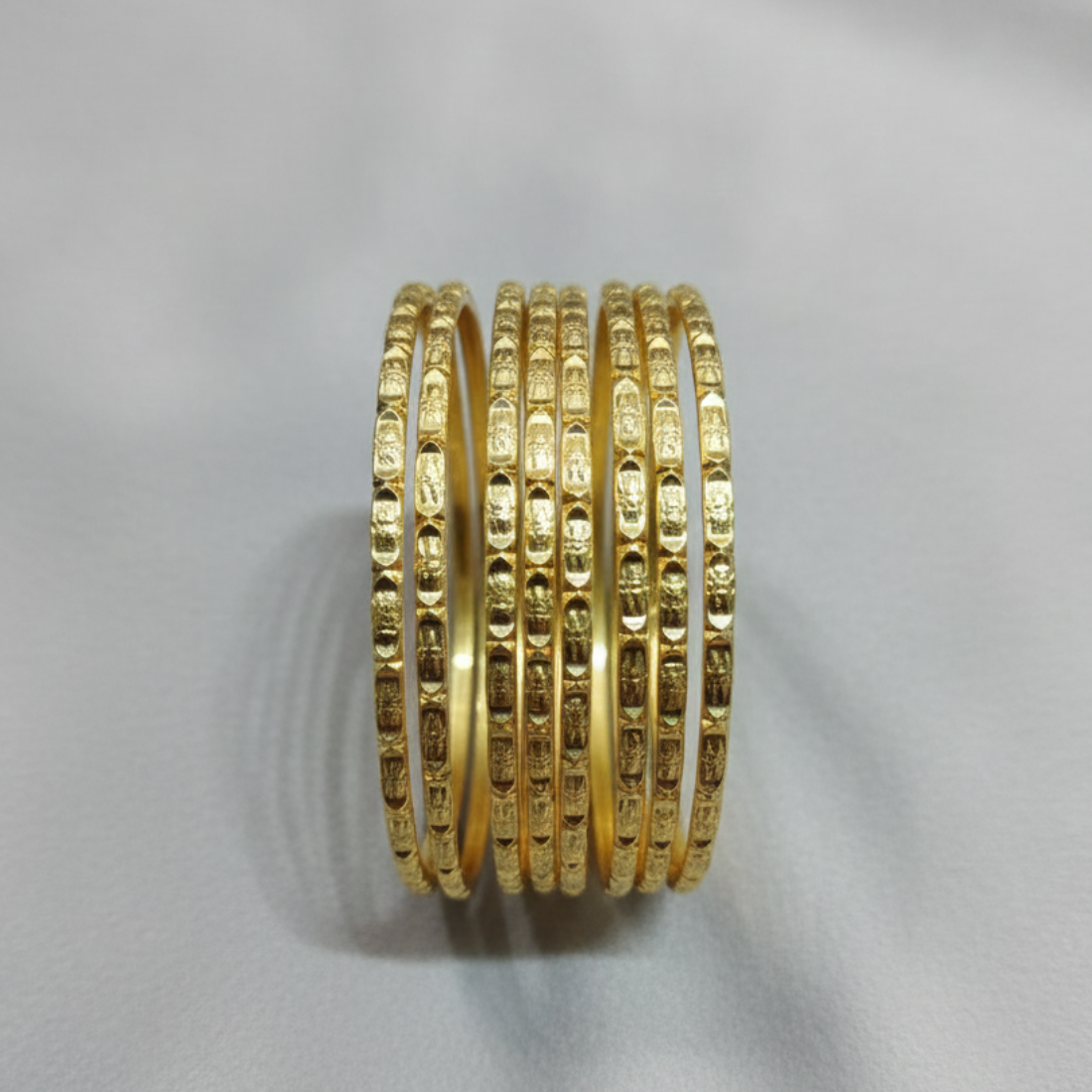 Sophisticated 22K yellow gold bangle set with intricate embossed patterns for elegant shine. Perfect for daily wear or special occasions on Meesho and Flipkart, this textured set offers timeless sophistication.