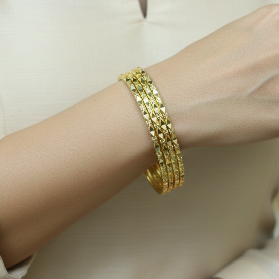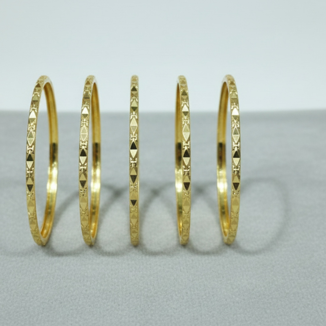Stylish 22K yellow gold bangle set featuring geometric diamond-cut patterns for contemporary shine. Perfect for modern daily wear or layered looks on Meesho and Flipkart, this textured set delivers sophisticated appeal.