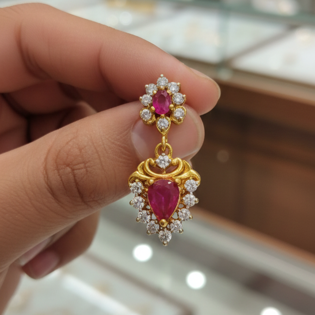 Exquisite 22K gold single drop earring with pear ruby centerpiece, diamond clusters, crown ruby rounds, and ornate filigree for romantic sparkle. Ideal for asymmetrical styling on Meesho and Flipkart, this piece delivers classic red brilliance with intricate temple detailing.