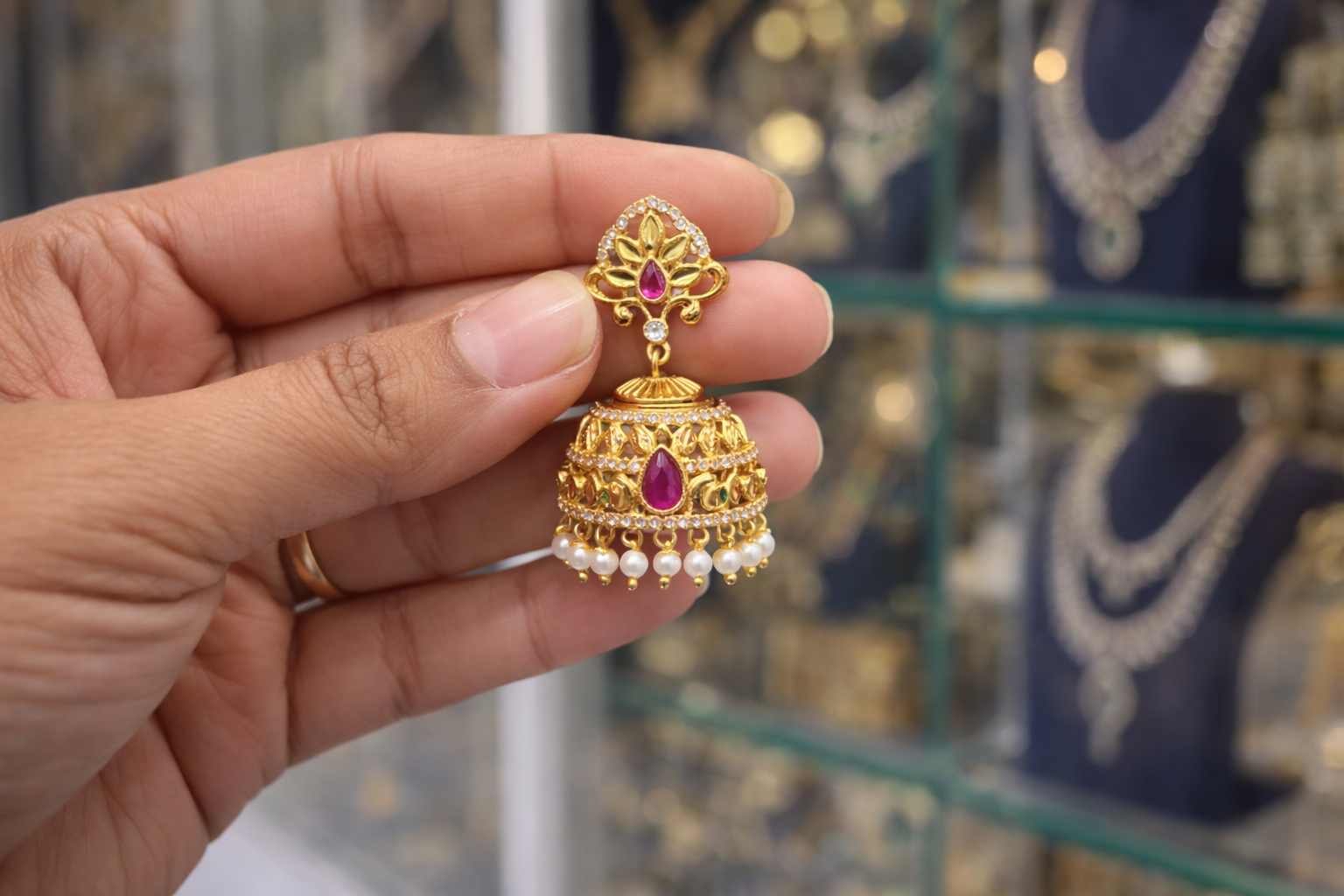 Exquisite 22K gold chandbali jhumka earring shines with a prominent ruby stone, diamond accents, and dangling pearls for timeless ethnic charm. Ideal for weddings or daily wear on Meesho and Flipkart, it offers lightweight luxury with vibrant appeal .