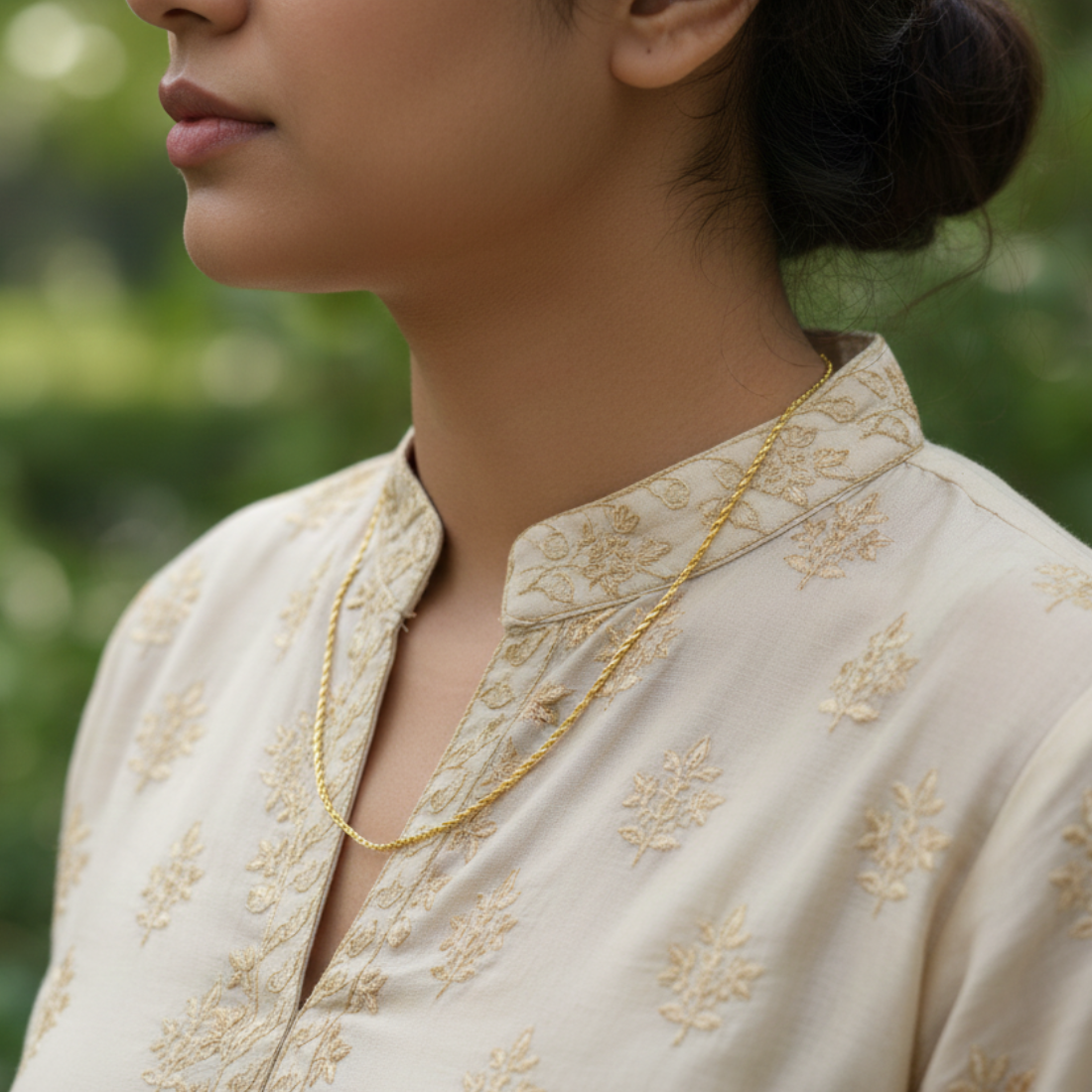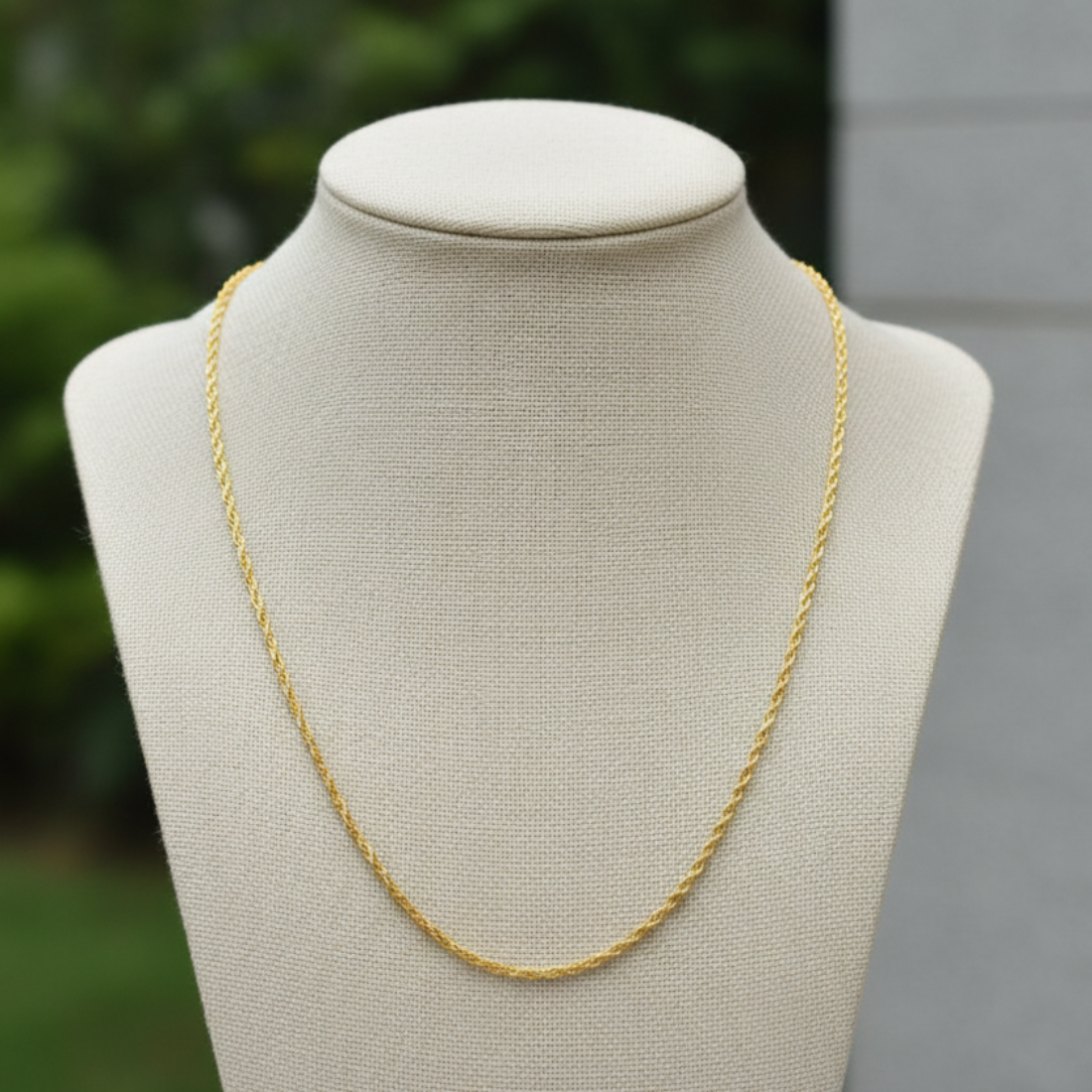 Elegant 22K yellow gold thin rope chain necklace with braided links for subtle texture and shine. Perfect for daily wear or layering on Meesho and Flipkart, this lightweight chain complements all outfits.